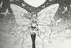 Sailor Heavy Metal Papillion... Beautiful, no? SHMP is the last of Galaxia-sama's Animamates, 'The Soul Hunter.' (Did you know Papillion is french for Butterfly?) SHMP is the gravekeeper at Zero Star Sagittarius. (Galaxia's Cathedral, picture at top.) She doesn't have a specific attack but can randomly ignite things and manipulate the vines in the graveyard. How she was destroyed: Amazoness Jungle Arrow, by the quartet and ChibiMoon.