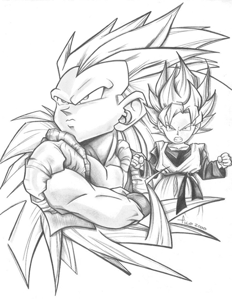 Goku's second child. Born sometime after the battle with Cell. At the time his older brother Gohan is 16, he is 7. Physically, Goten looks just like his father when he was young, especially because of the hair. Apparently, the genetic coding for hair in Saiyajin lower-level warrior males comes from a limited pool, for Goku's father Bardock also had similar hair and a totally unrelated lower-level warrior, Tulece also had a similar hair-do... ANYWAY, Goten is a boy full of energy who has learned basic martial arts skills from his mom, training with his best friend, Trunks, and from his brother Gohan. His innate fighting ability inherited from his father, just like Gohan, is great. He has naturally mastered, along with Trunks, Supersaiyajin without going through special training or using anger as a trigger. Goten enjoys playing and fighting more than studying, for apparently, Chichi was less harsh on him than his older brother. He enters the 25th Tenkaichibudoukai, which turns out to be a kind of reunion of sorts, since the late Goku was granted special permission to visit the real world and attend the tournament for one day. Thus, Goten sees his father for the first time. In the Kid's Division of the Tournament, Goten ends up fighting Trunks for the championship, and narrowly ends up with second place. Goten and Trunks also enter the Adult Division, masquerading as another fighter, Mighty Mask. During the Buu confrontations, Goku, with his limited time on earth, teaches Goten and Trunks a new technique he learned while he was in the other world-Fusion. Fusion, a technique of the Metamoru Aliens, allows two fighters of similar power levels to fuse to become one, stronger fighter. With this technique, the two kids become Gotenks, an almost totally different character-a haughty one at that. Gotenks successfully fights evil Buu, but like Ultraman, time runs out, before Buu is completely defeated. Ten years later, in the epilogue, Goten is a teenager leading an ordinary life, trying to date girls.