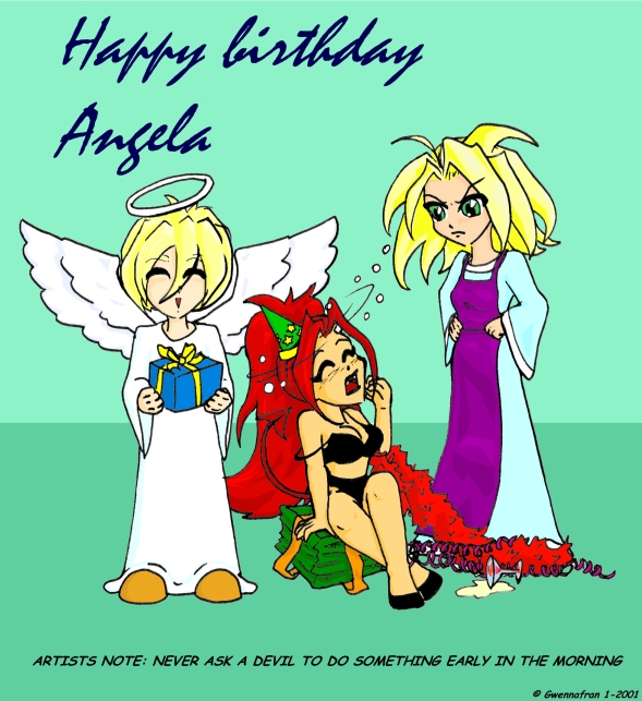 Birthday cart 02-05 2001: I gave this to Angela on her birthday. Or that is... A week after her birthday actually. (It's so embarasing. I didn't made it in time) Remind me not to tell Stereotype Devil to do something at dawn, OK?