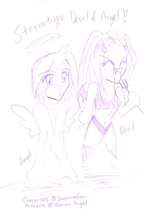 ![]() | Mookie made me a beatyful version of my two little Stereotypes. She even got the little devil to colour her hair for the ocasion. ^-^ It's actually quite amasing i haven't made a motive like this myself yet. I had a sketch scratched up once, but I gave up on it. *L* She beat me on that one. ^_~ I simply loves the way she has made the hairstraws on this one.