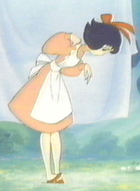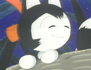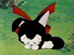 Katy is both a cat and a human! She really is a cat who was abandoned by her family (human family probably). She dreams of becoming a witch so she can do whatever she wants to people who are mean to her. Unico meets her and they become friends. The two of them float down a river in a basket until they come to a forest with a cottage that an old woman lives in. Katy is convinced that the old woman is a witch, but is apparently not. Katy then decides that if she's to be a witch, she has to be a human girl first (since a kitty witch might look funny). Unico grants Katy's wish because they're such good friends and Katy turns into a human girl. Katy thinks that the Old Woman changed her and thanks her by helping her out around the house. However, Katy grows tired of her chores and wanders off to a field to do nothing. Unico finds her and tell her she should do her work because the Old Woman is very old and fragile. Katy refuses, and Unico tells her that he changed her, not the woman. Katy doesn't believe him, so Unico changes her back to a cat. Katy then wanders around the cottage as a cat again and then realizes that the Old Woman really does need help and that she's really lonely. Katy tries to help out as a cat, but just gets in the way, and becomes very sad about it. When the Old Woman falls into the creek while washing clothes, Katy dives in to save her. While she's diving, she changes back into a human girl and she rescues the Old Woman. From then on Katy is a better person, but soon gets in trouble again when she meets Baron DeGhost.