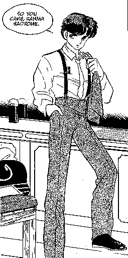 In the grafic novels 2 and 3, P-Chan is stolen by Azusa who names him Charlotte. Akane is then challenged to a fight. Mikado then tries to kiss Akane, but Ranma flicks a fish-cake at him and so Mikado challenges him. As Akane and Ran-chan are practicing Azusa steals P-Chan and Akane goes after her. Meanwhile Mikado has Ran-chan and kissses her. Ran-chan runs in to the shower where she changes back into a man. Ranma and Mikado fight and Ranma knocks him out. At the Martial Arts Figure skating match Mikado and Azusa use theCouple Cleaver against Ranma and Akane. This attack spins the couple around so fast that they crash int the wall, but Ranma never lets go of Akanes hands! Ryouga then turns out the lights and trys to get Ranma off the rink so that he can skate with Akane, but He ends up bringing Ran-Chan on. In the end Ranma and Akane and Ryouga win the match and Akane keeps P-Chan! |