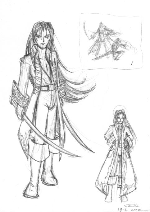 Skitse til Dark Lands 4 19-2 2002. Og mere skitsering til Dark Lands. Her er det den kvindelige barbars mandlige modspil der bliver leget med designforslag til. Og så er der også lige et lille kompositionsforslag...