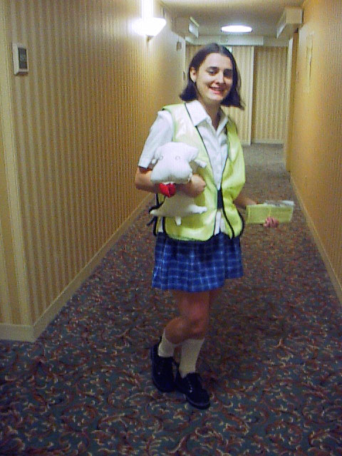 well i fianlly got my badge and..wow... some information. did YOU know James Polk served the shortest term in office as president. yeah... and Video 1's schedule is all messed up.. greeeat... so i got this really nifty, cool, neat-o...yeah..stupid looking... yellow vest to wear over my Yukino Miyazawa costume. Lucky me, i had to wander around offereing my vast knowledge to the unknowing and unsuspecting. what fun.