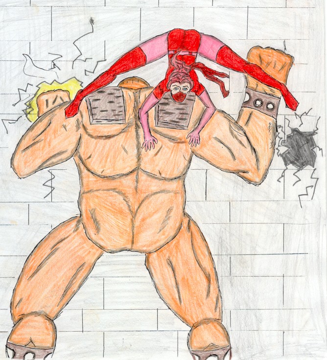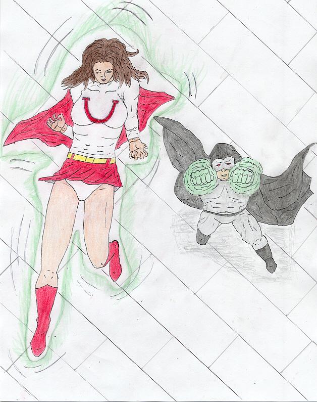· Lady Ultra battles Grimlord · Lady Ultra blasted into wall ·