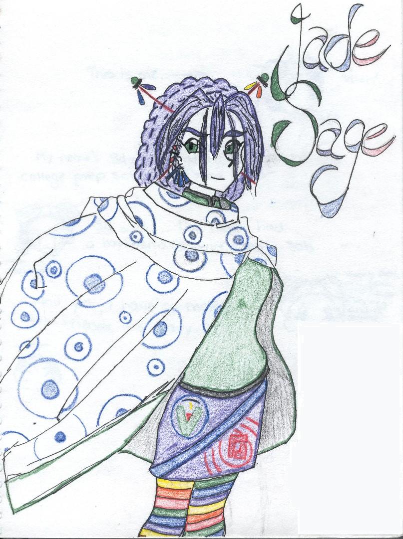 Comments: First image I drew of my anime persona, Jade Sage, in her Sage form. Why the rainbow stockings? I don't know... but she doesn't wear them anymore. It's done in an 'Ah! Megamisama!' sort of style, since that's what I was reading when I drew this.