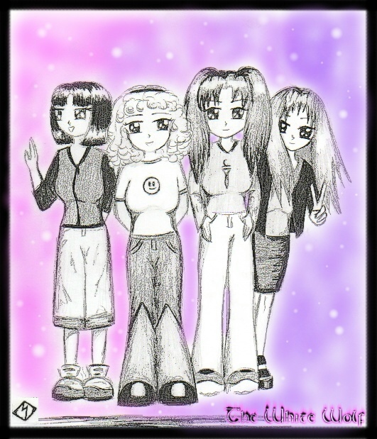 I drew the curly haired blonde first, but she was off center so I drew the girl with a pigtail to keep her company. Then, 'cos it still didn't look quite right, I drew the girl with the bob. The other girl was just an afterthought which didn't work as well as I would have liked. When I scanned this pic onto the computer, it was really plain 'cos I hadn't bothered to put any background detail in. I cropped it down and turned it into a charcoal drawing using the Artist Effect tool in Photo Express. Then I used airbrush on very soft edge in four colours to paint the background. Lastly, I used paintbrush on soft edge in differing sizes to produce the little white fuzzy star things. |