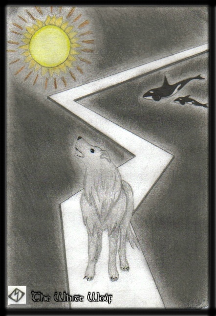 Frankly, I drew a wolf. Then I couldn't be bothered to draw an elaborate background, so I drew a zig zag across the page. That turned into a path. Then the picture was unbalanced so I drew a sun. Then someone said to draw killer whales, so I did. Then I just shaded the background in with my pacer and smudged it with a tissue. That's all there is to this pic. Oh yeah, I used pencils for the sun and a black felt tip for the darker details. |