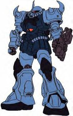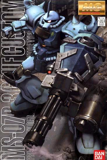 Webmaster's note: The Gouf Custom is a continuation on the theme of a Gouf; a high quality ground mobile suit lacking hoverjet engines. Similar to the original Gouf in many respects, the custom has multiple small external differences that make it easy to differentiate, including the additon of a central square cockpit window. Other improvements over the old stlye Gouf include a massive 6-barrel 75mm gattling gun attachment for the shield, and a 3-barrel 35mm machine gun in place of the old 5-barrel 75mm. Each of the three barrels contained a six-barrel vulcan cannon, explaining the small size of the bullets. The MS-07B-3's heat saber, unlike the MS-07B's, was a standard model with a simple heated blade. Meanwhile, the Gouf Custom's heat rod, rather than a tentacle, was more like a simple wire with a knob on the end. Though slicing ability was negated, the new heat rod had longer range, could be used as a magnetic grappling hook, and could deliver a disabling shock to an enemy simply by sticking the end to their mobile suit.