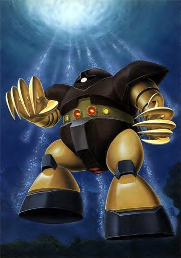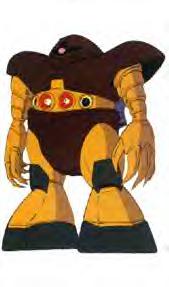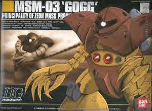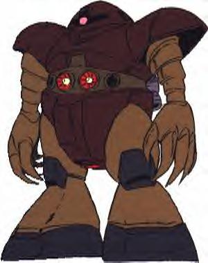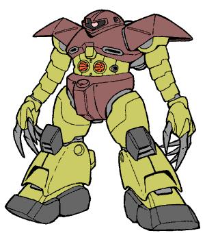 Webmaster's Notes: The MSM-03 Gogg, one of the first mobile suits produced by Zimmad Corporation, was a success primarily because it abandonned the concept of a traditional mobile suit for amphibious combat. Rather than being shaped like a Zaku, the Gogg was stocky, its massive body capable of holding a large generator and ballast tanks to keep the Gogg submerged. Because overheating was not a problem in a mobile suit that found itself being cooled off in the water regularly, the Gogg's generator was capable of powering two mega particle cannons, both mounted on its stomach. On either side of the pair of cannons was a torpedo launcher, capable of attacking ground targets but also the Federation's Himilaya Class aircraft carrier and Diving type GMs. Though expensive to produce and slow on land, the Gogg was increadibly difficult to kill, missiles having almost no affect against its thick torso armor. Meanwhile, its massive clawed hands mounted on long, telescoping arms were capable of inflicting considerable damage in a close combat fight. A launcher mounted in the Gogg's head could fire a net that would surround the mobile suit, protecting it from mines planted in the water, while five hydrojet engines, two large ones mounted on the backpack and a row of three small ones running between the legs, propelled it at an impressive speed through the ocean. Aside from slow land speed, the Gogg's only weakness was the location of its weapons, which made them difficult to aim on land and forced the Gogg to turn upright if it wished to fire torpedos at an enemy ship while submerged.