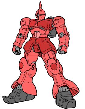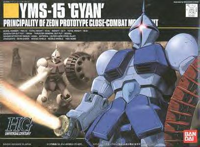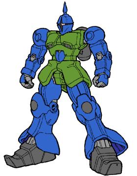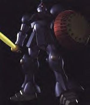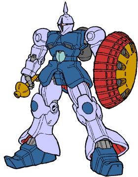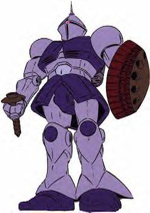 Webmaster's notes: The YMS-15 Gyan was designed by Zimmad company to compliment its highly successful MS-09R Rick Dom. Allowing the Rick Dom to support it at long range with its 360mm bazooka, the Gyan would serve as a close range fighter, equipped with a thick beam saber and a shield. Unfortunatly, the concept of a close range only fighter was not the type of thing Zeon had the pilots or the time to produce, and the Gyan never made it past the prototype stage, one of these units going to Zeon's Colonel M'Cuve, who oversaw the Gyan's production, the headspike on the Gyan having been adopted form that used on his personal Gouf. Equipped with a thruster backpack similar in style to that used on the MSM-07 Z'gok, the Gyan could propel itself at an impresive speed, comparable to the MS-14A Gelgoog and RX-79 Gundam. In addition to this, the Gyan was not totally defenseless at medium range, its shield mounting an impressive 56 "needle missile" launchers, as well as being able to launch 12 floating mines, making the Gyan the only mobile suit other than the Zaku Minelayer type able to do so. However, the concept of a weapons studded shield was too elaborate compared to simpler firearms more often used in grunt mobile suits, another reason the Gyan failed to see mass production.