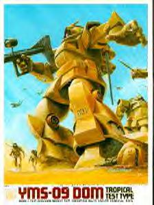 Webmaster's notes: With the establishment of the Dom as the succesor of the Zaku for ground combat, a replacement was also needed for the MS-06D Zaku Desert Type with its special heat radiating equipment. The YMS-09D Dom Tropical Test Type was this replacement, using a significantly different frame than the standard Dom and mounting a special cooling system on its back. Like the Desert Zaku, the Dom TTT was also equipped with a communciations antenna, a necessity in desert regions with few bases and vehicles to otherwise relay transmissions between mobile suits. The Tropical Test Type was produced in small numbers and did not see a mass production version, though the MS-09F/trop Dom Tropen would eventually come to fill that role.