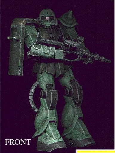 Webmaster's comments: Though very similar to the MS-06F General Purpose Zaku II, the MS-06J Ground Use had its fair share of difference. External changes from the F type include differently shaped thrusters, slightly different forearms, a lack of leg mounted verniers, and in some cases studs protruding from the shoulder shield. On the inside, the Zaku J type had a more powerful reactor, making it better suited for conditions under the effect of gravity. Armed in an almost identical fashion to the F type, the J type sometimes uses a 175mm cannon refited from a Magella Tank for long range support fire. The 280mm of the J Type seems to be a different model than that of the F, mounting three exhaust vents instead of four and a clip for amunition instead of shotgun style loading. The Zaku II, along with many other ground mobile suits, is water proofed.