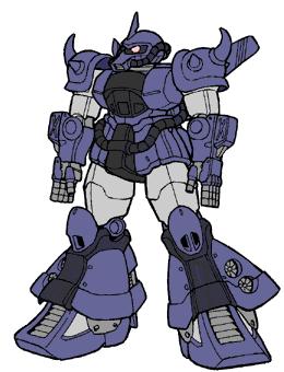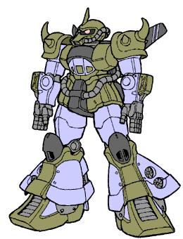 Webmaster's notes: The first try to make a flying mobile suit was the MS-07H Gouf Flight Test Type. While the standard Gouf could make short thruster assited jumps, a mobile suit that could maintain sustained flight was desired to provide air support for ground pounding units. The Gouf Flight Test Type's legs were equipped with massive jet engines, and fins were added to its backpack. It also mounted two 5-barrel hand machineguns, most likely to make firing easier mid-flight without having to handle a cumbersome weapon. However, in cases where more intense fire-power was needed, the Gouf FTT's bulky hands could grip a 360mm giant bazooka. The design proved flawed, however, and was updated to new models to try and fix the problems.