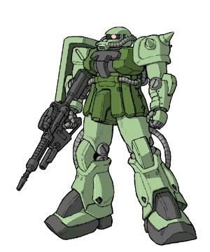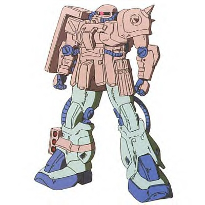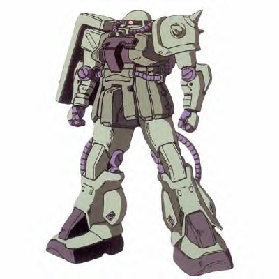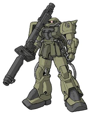 Webmaster's comments: The Zaku F2 is, obviously, the sequel to the F type. It is a more versatile approach than the MS-06FZ Zaku FZ, which upgrades the Zaku's preformace too far and suffers from rapid fuel depletion. The F2 instead continues the tradition of a general purpose, highly effective mobile suit. Operationg well both on land and in space, the F2 eliminated any need for a J2 type Zaku. Using many of the same weapons as the MS-06F but also Sturm Faust RPGs, the Zaku F2's weapon diversity was everything you could ask for. The F2 also equiped a reactor powerful enough to charge a beam rifle, but such a rifle was rarely used, most likely due to beam weapon shortages. On land, the F2 could be equipped with a booster jet on either side of its backpack to provide a short term boosted jump, taking the F2 to an impressive altitude. The F2 shares the dashing looks of the standard Zaku II, the main difference being much thicker chest armor on the F2 that protrudes outwards where the F type's is flat.