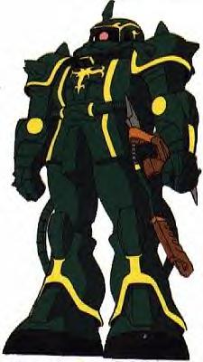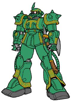 Webmaster's notes: Like his brother Garma, Dozle Zabi had a customized Zaku II made for him. However, unlike Garma's unit, Dozle's was completely one of a kind, a customized MS-06F with a brilliant green and gold color scheme. Featuring many menacing external features, such as engravings, a thick command antenna, dual spiked shoulder armor, and spiked hands, the unit stood out easily from un-customized Zakus. It is unknown whether Dozle's Zaku was upgraded performance-wise or not. Dozle had his unit equppied with an extra-large heat hawk, similar to the one Ranba Ral used with his Zaku I, but even larger than that.