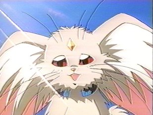 Ryo-ohki - She can transform into Ryoko's spaceship. A sweet little cabbit(cabbits are half cats half rabbits) Ryo Ohki's faveorite food is-Carrots!!!! When Washu looked into her mind, it was mostly carrots! In Pretty Sammy Ryo Ohki is a guy and can talk!!!! In the Tenchi Muyo OAVs Ryo Ohki has a cute human form and this adorable dance! Ryo Ohki can only Meow, Hiss, Purr, anything cats can say-Ryo Ohki says it!!! Ryo Ohki is also in love with Ken Ohki in Tenchi Universe!!!