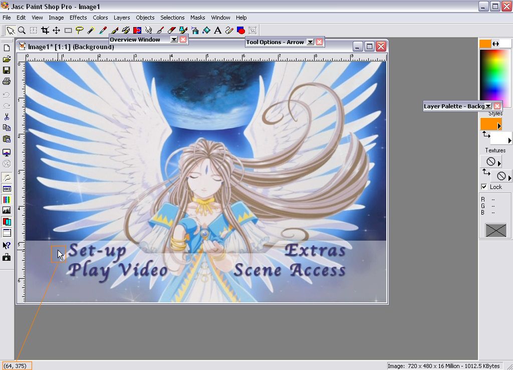 Open up notepad and get ready to write down a few values. Open the capture of your first motion menu in paint (these caps should still be in DVD2AVI's folder). Here you should be able to get a good idea of how many selections exist on the menu and such. This is how we use that info; move your mouse over the area where the number "1" will go (the first selection). You should see the coordinates in the bottom left corner of your paint program.