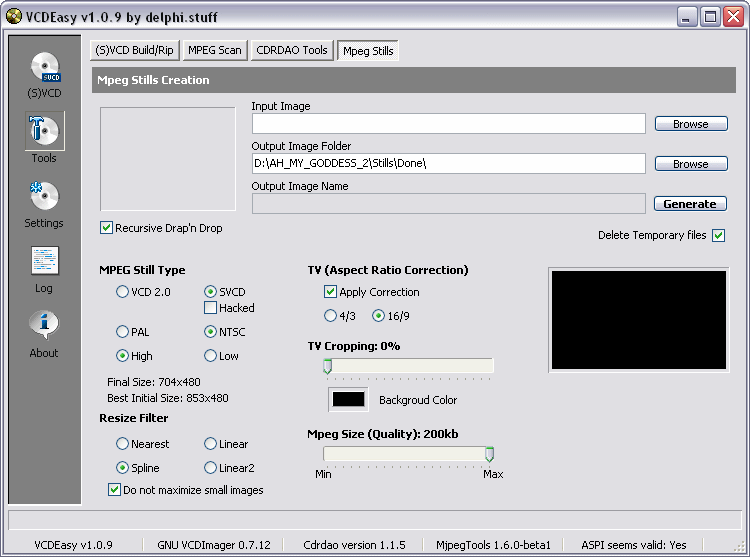 Anyway now you'll want to drag all of your bitmaps in the stills\done folder into VCDEasy and let it generate the still menus for you. Make sure the output is in the stills\done folder as well. If you're tight on space, you can lower the Mpeg Size slider, but this will only have a big effect if there are a lot of stills.