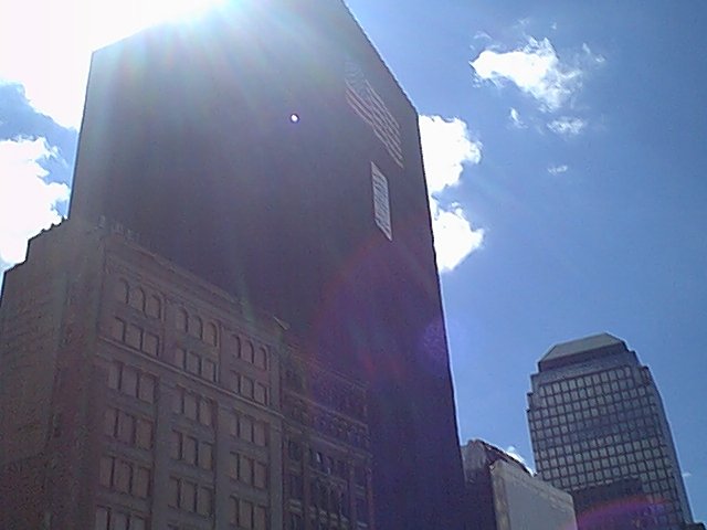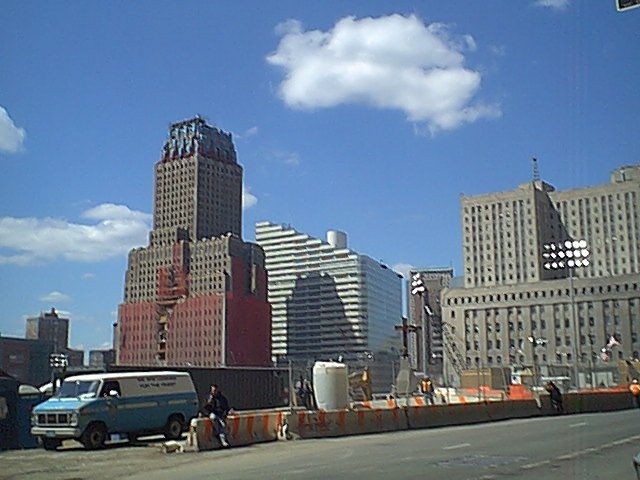 During my past visit to New York, I saw ground zero firsthand for the first time. My digital camera is 2 years old and cost $200 so the images are not top quality, but bear with me. The experience is undescribably, incredibly eerie. This page is dedicated in memorium to all the blood that fell on that day 8 months ago.