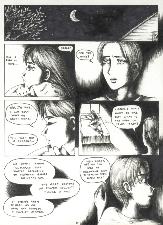 Serle is obviously very sad and confused, so Andrew promises her that she can stay with them until she finds her way home. Melissa reluctantly shares her clothes, so Serle changes out of her space suit. But when she turns around, Andrew and Melissa are shocked by the appearance of a strange purple mark on her back. "It's my Palaean mark," she explains. Melissa then drags Serle out of the house to go shopping for the things she will need...leaving a fuming Andrew to explain the mess to their parents. That night, Serle wonders about her appearance on this planet.