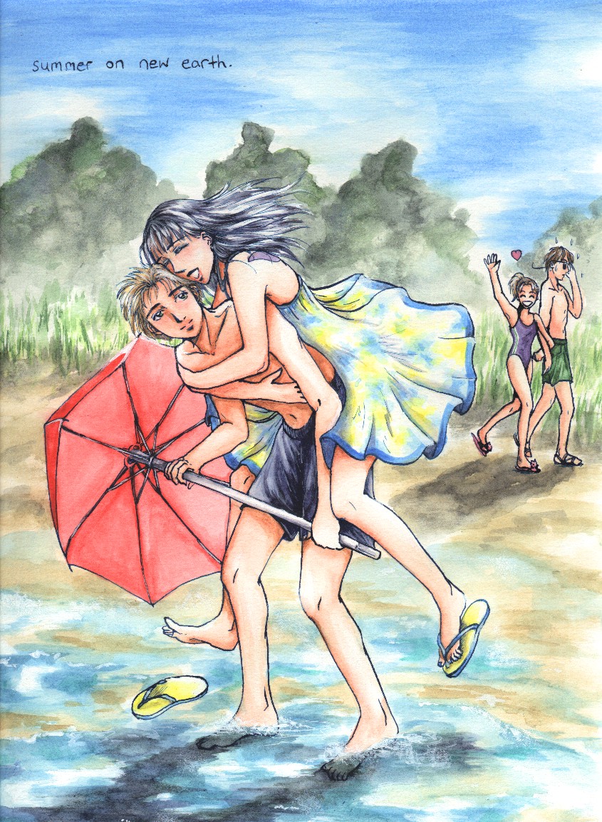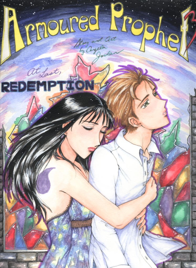 A. The character I relate to the most is Serle. When I created her, I didn't intend to model her after myself. but over time, her personality shone through as my own (I actually used this concept for an enormous graphite drawing of myself with Serle reflected in the water. I'll scan in a picture of it eventually). I suppose I resemble her visually, too, because we both have bangs and long hair. But I have blonde hair (Serle's is black), hazel eyes (Serle's are purple) and glasses. The character that's the most fun to draw is definitely Melissa. She's the loud one in the group, and her emotions are always visible on her face. She's never contemplative and passive, so she's a lot of fun. Andrew's also fun to draw when he's sulking, and Serle when she's terrified.Got a question pertaining to Armoured Prophet? Or just got a question? Send it in!!
