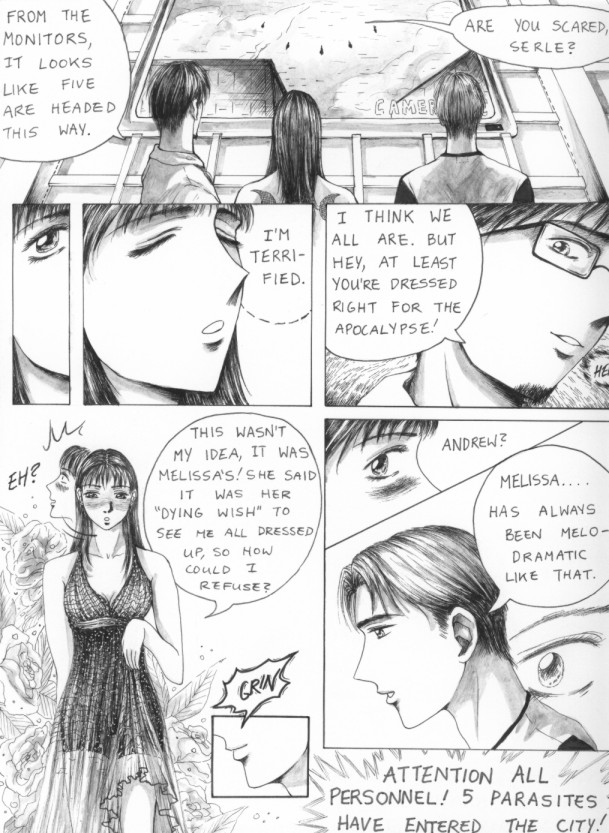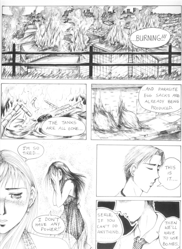 One month later, the parasite mass breaks apart and the battle begins. Serle has a vision of the parasites coming and doubles over in pain.
