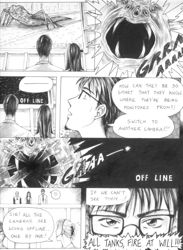 The tanks fire...but the parasite immediately clamps its mouth shut. The shots don't even dent it. Then, the parasite spews acid all over the tanks, destroying them and everyone inside them. Brian orders a rescue team to be sent out there, and suddenly the parasites' wings split apart into sections and they land on the ground, having converted their wings to legs.