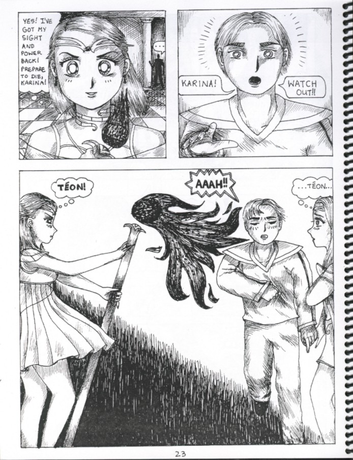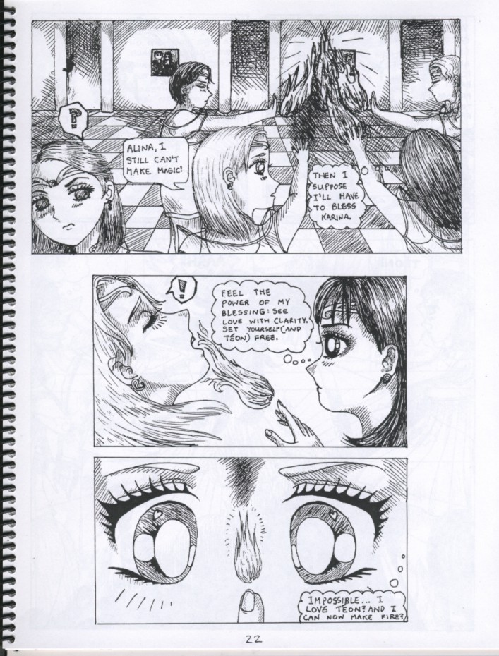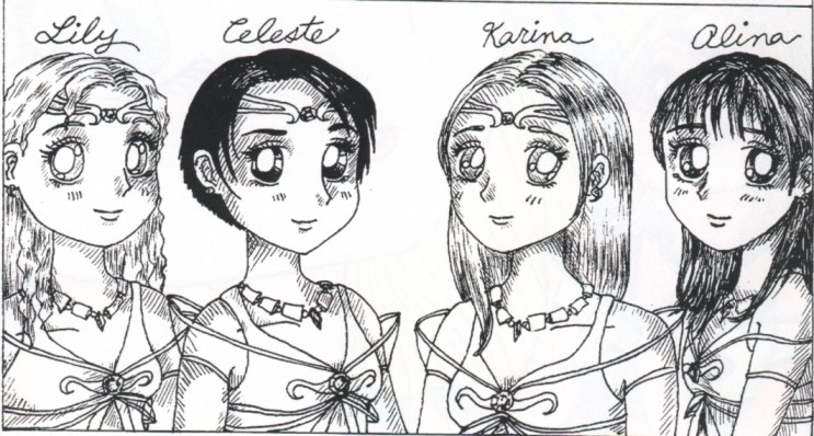I created this as part of the Enrichment Program at my high school. It's a cute shoujo manga (Japanese-style girl's comic) about a young girl named Karina Meadows who finds out that she is one of four warriors who are destined to fight the Dark Evil that approaches the distant planet Ganae every 500 years. She has to master her power, green healing fire, in order to defeat the enemy. But Karina is distracted by her confused feelings for her guardian, Teon, so she must first learn how to love before saving planet Ganae. Here are some pictures.