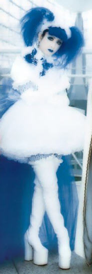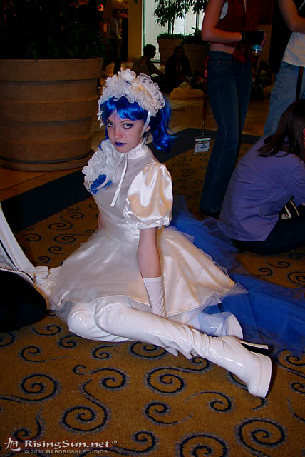 | how? oh and did it ever prove to be a challenge. not only for my skills, but for my wallet as well! (altogether this thing nearly cost $200!) but it's easiest to explain this costume step by step, so here goes: underskirt: originally made from about 6½ yards of tulle, but 6-7 more yards were added after ax '02. i cut the the tulle into pieces measuring 17" x 50" and then gathered them. two pieces were then sewn into one long one that fit around my waist and slightly over-lapped. this was used as a base upon which i sewed on the rest of the tulle. skirt: made from white satin. i measured the underskirt and discoved it had a radius of 21". i took a piece of posterboard and cut a skinny piece 21" long to use as a compass. after i traced out the skirt, i measured the 'circumference' of the bodice, found out its radius, and used that measurement to create a circular hole in the center of the skirt. (geometry.. who knew?) i then used the above compass method to cut out four layers of tulle to go over the skirt, making each layer smaller than the previous one (if that makes any sense.) the layers were sewn on around the inner circle of the skirt, except for one part so they wouldnt' block the zipper. then i sewed the skirt to the bodice. ^^ bodice: made from above-mentioned satin and a white lace, patterned with flowers. for the bodice, i combined elements from the two bodices in mccalls pattern 3292. the lace was used in the 'outer' side of the princess seams and was sewn on over the satin. on the sleeve bands i sewed sequin trim, just for kicks. ^^ i bought fake flowers from wal-mart and sewed them on the bodice by making tiny stiches on their bottom leaves. i also got some dangely bead and rosette things and sewed those on as well. bow: i got six or seven yards of blue tulle, cut it into two equal pieces, folded the top over, and gathered it along apiece of velcro, which attaches to the back of the bodice. headpiece: i made this the same way as my beast of blood headpiece (you can read about it here) except that i added gathered lace in between the layers and sewed flowers and dangley stuff on the top. everything else: got the wig at wizard's chest for $35 and gloves at the same place for $6. the boots were purcahsed from funkee feet for $80 and i sewed trim to the top of them. for make-up, i purchased some blue ben nye stuff. (ben nye is high-quality and affordadble stage make-up, and something i highly recommend over halloween make-up.) |