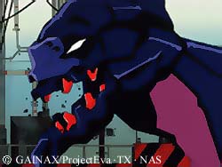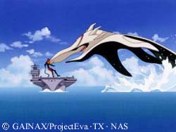 Behold Gaghiel, the sixth angel. He lurks deep in the ocean blue, and attacks UN Pacific Naval Fleet. At the time, Asuka and Shinji are aboard, and they go into EVA Unit 02 (its debut) and lure it to its doom, through an intricitely woven plan. Its only weapon is a pair of extremely powerful razorlike jaws, that can rip through an EVA's body, like that! |