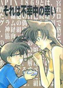Sorewa fukouchuu no saiwai Conan's dozing at his desk at school when suddenly he changes back into Shinichi! Ai slipped the antidote into his lunch when he wasn't looking! Of course, Shinichi runs straight to Ran, but it wears off by the time he reaches the door. See how depressed Conan is, Ran suggests they share a bed that night, Conan agrees and they both fall fast asleep. However it looks like the antidote is playing tricks because on the last page he's turned back in Shinichi! Very funny and one of my favourites despite it's thinness (I wanna see what happens when Ran wakes up and finds herself in bed with Shinichi!). |