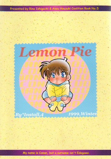 Lemonpie 1, 2. 3. This is probably my favourite doujinshi. The story is set after Shinichi & Ran are married and starts with Ran telling Shinichi that he's going to be a Daddy (he's thrilled until the baby does come and he gets a tad annoyed about the time Ran spends with baby instead of him!). They have a son whom they call Conan (hmmm…) and there are lots of little stories about them coping with being parents. Poor Shinichi gets the raw end of the deal as little Conan seems to love making trouble for his Dad! Kaito Kid, Heiji and Kazuha turn up as well with their respective kids. Kaito has a daughter while Heiji & Kazuha have twins (boy and girl). Little Conan and Kaito's daughter meet when they're young and when older, she becomes the Kaito Kid while he becomes a detective… the only hitch is that they like each other very much! I know that Lemonpie 4 has been produced and have heard that there's a final book coming out in May. If you love Shinichi and Ran (or just love Detective Conan), then I recommend this doujinshi! | Back cover |
