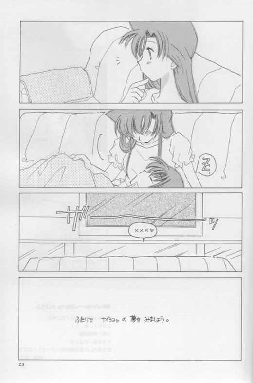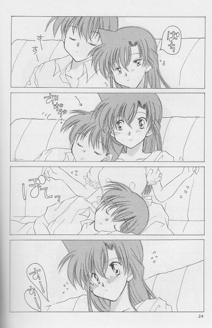 Yume no naka ni sasou kiss- 2001 summer. As the title suggests, there is a lot of references to kissing in this book, as well as Shinichi and Ran indulging in some kisses of their own. The last 3 panels at the end have hardly any words, but the pictures speak eloquently - take a look for yourself: |