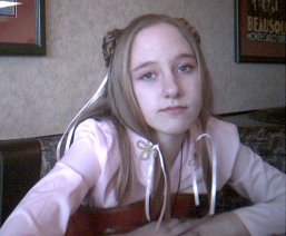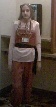 (Souken) The pattern I had for the pants was actually a pattern for an Aladdin costume. The pants were the easiest part of the whole costume, and took me about a half an hour. The shirt, on the other hand, gave me lots of trouble. The pattern for the shirt was one I bought at the thrift store, and is probably not even sold anymore. It worked out okay, except I used the wrong size and it came out too small. The red part of the shirt is a seperated piece, and for that I cut out a section of the shirt pattern and made it a bit bigger. I placed interfacing on the inside to keep it stiff and I used fabric paint for the gold designs. The black sash was just made out of leftover fabric I had. As for the gold clasp on the collar, I found that at Wal-mart.
