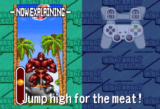 As the picture suggests, press the buttons at the correct rythmn to make your Body Builder pogo high enough to catch the meat. And yes, that is a Gradius Maoi hiding in the background...there are quite a few Konami cameos in Bishi Bashi Special if you look for them.