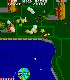 So...this is the original Twinbee from 1985. It's quite good actually, particularly the Arcade version which looks & sounds a lot better than the Nes port. As you'd expect, the gameplay provides much of the template for the later games. You scroll vertically up the screen, shooting at the swarms of vegetables that the CPU throws your way. You're slow and they're fast, so you won't hit every enemy in a group...but if you do, then you get a points bonus. Clouds drift past and spray out bells if you shoot them...collect the bells and you get points - BUT, if you fire at the bells they'll eventually change colour and give you a range of power-ups instead. Blue bells boost your speed, White gives you double shots, Green summons wingmen and Red gives you a shield. Unfairly, if you do manage to get the elusive red bell, the screen floods with eggs (or something) which try to crash into you and knock down your defences. In gameplay terms, the power-up structure works well - you have to earn your enhancements by attentively keeping the bells on screen until they change colour, all the while avoiding and destroying the actual enemies. You also have two types of attack - a straightforward shot for aerial opposition, and bombs that you can throw. While most of the time you'll just be shooting stuff out of the sky, you also have to check the ground and respond to threats accordingly. Your Twinbee dies if it collides with anything head on, but if it manages to take a hit in the side, then all it'll lose is an arm. Having less than two arms effects your ability to bomb though. Lose both arms and a medical thing will appear from the top of the screen and attempt to fix them back on. There's also a simultaneous 2-player mode which offers a lot more versatility. Twinbee and Winbee can link arms to combine firepower and shoot fireballs, or alternatively, one player can hover just above the second to create a fan shaped wave of shots. In short, there are a lot of little nuances which make the game distinct from other shooters out there.