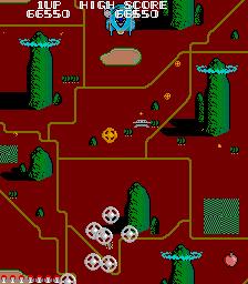 The graphics are colourful and crisp, though they don't have the same anime feel of the later games. The landscapes you fly over are limited to basic types - forest, desert, mountain - and they start repeating (or at least looking very similar) after level 4, but they're nicely detailed with roads, lighthouses, etc. and lend variety to the levels. On a gameplay note, the background art is purely scenery...there's no danger of crashing into it, so you've got the full length of the screen to manoeuver around. There's not a lot of music, with the same tune playing throughout apart from when you encounter a boss or collect a power-up, but what there is sounds nice enough. Don't expect the quality of Detana Twinbee though, or you'll be disappointed. The enemies are your basic vegetable types really, turnips, peppers and runner beans although there are insects as well...I can't say why because I don't know the storyline. Somehow though, they feel entirely appropriate. At the end of each level there's a boss fight against a larger ship - unfortunately they all look the same apart from different colouring. There's nothing complex about the bosses really...just shoot them anywhere and for as long as possible until they explode - sometimes after a surprisingly short amount of time. They attack by summoning enemies after you, but they play fair and are satisfying to kill.