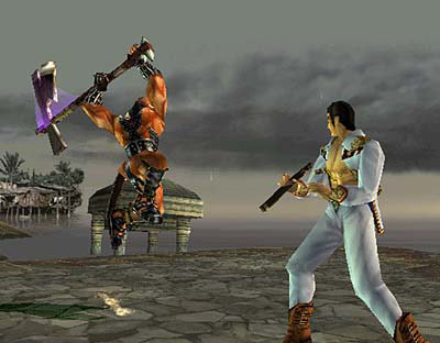 V-Babe: THAT'S EDGE MASTER'S LINE! Oh, well, back to the commentary. Astaroth swings his axe again, but Maxi blocks the attack. Astaroth then holds his axe in front of him and starts spinning around.....and laughing moronically. Gee, Asty, if you're supposed to be intimidating....Man! He's still spinning! Soon Astaroth gets dizzy and he's staggering. Reminds me of Yoshimitsu!