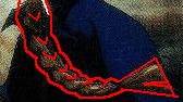 I've tried my best here to show how the bumps in his hair are and how the chunks in his braid show up. (The thick chunks are in blue, the thinner ones are in red.) |