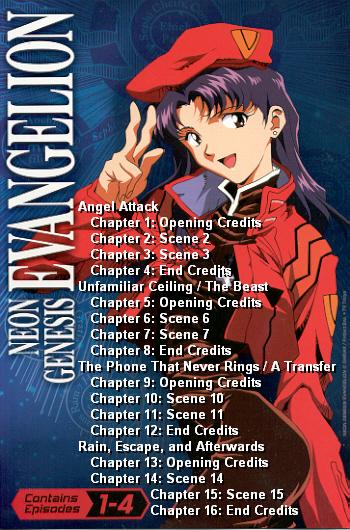 Neon Genesis Evangelion Collection 0:1Perhaps this does not apply for the box set release of this series on to DVD, but the first Evangelion collection's liner notes suck. All they feature are the box art from the second VHS release for this series on one side, and ads for the first DVD titles released by ADV Films. The liner notes I have developed are rather simple. I have placed the chapter listing of this DVD over the image of the second VHS released featured in the original liner notes and I have also placed the chapter listing over two Evangelion postcard I found a few years ago in London. I guess all I can say now is to select the one(s) you think is best fitting for you. Just click on the thumbnail and the image will appear in its own window. Then follow the above directions. Hope you enjoy^_^