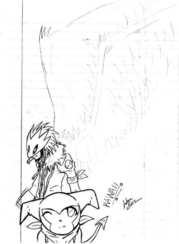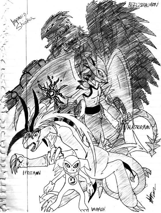 A good sketch of Impy, his adult Ifrit(from my doujinshi), his perfect Alastormon(from my doujinshi), and Beelzebumon