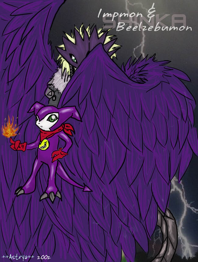 Something VERY VERY rare! A color CGed (in Photoshop)pic of the same Impmon and Beelzebumon sketch above this one ^^.. it turned out pretty good for a 2 hour job...