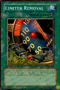 | Eugene1357 | limiter removal, thjis card needs to be timed right, if you use it and he uses waboku u just lost all your mons for nothing, this card also has been unrestricted to 3 recently in japan i give this card a 2/5 good in machine deks but not great, also i had a good review for this too but my mouse screwed me up and i dont feel like typin again. |