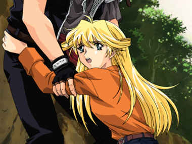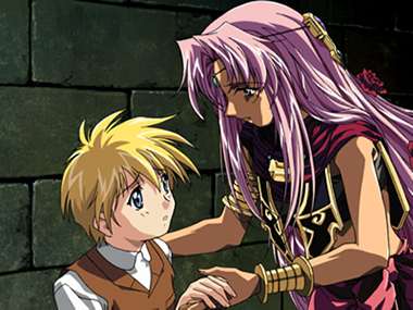 A closeup of Creao holding onto Orphen...
