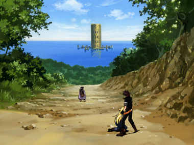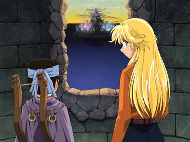 Mar looking at a tower in the distance and Creao holding onto Orphen