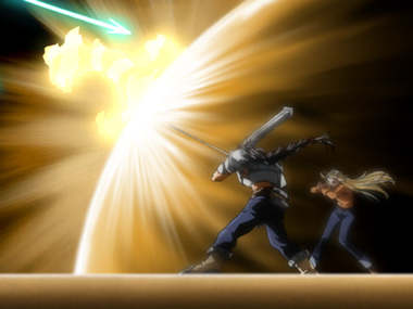 Sephy staring down at broken shards while Orphen and Majic/Magnus stand behind her