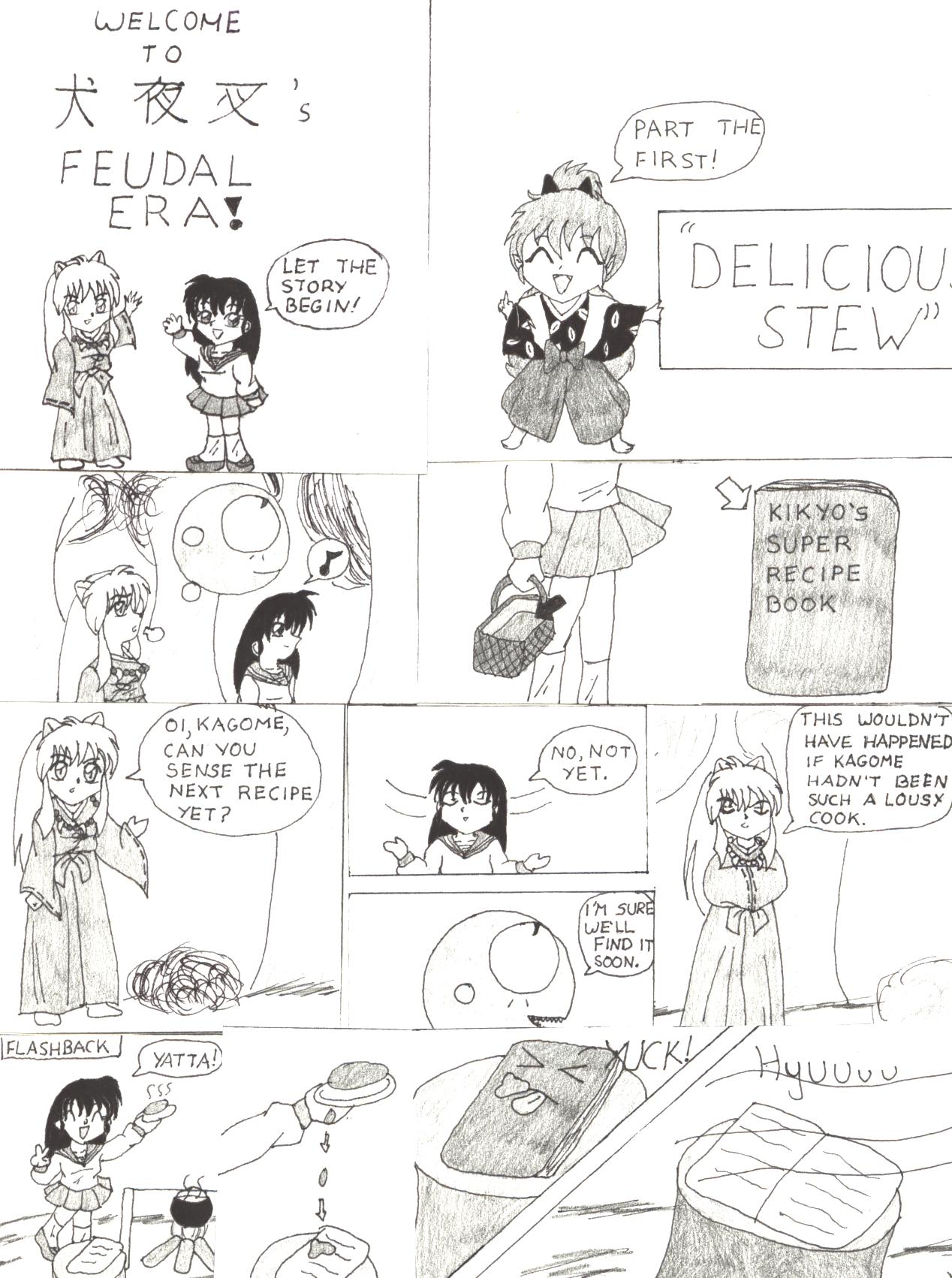 Unfortunately part of the edge got cut off in certain places. The title is "Delicious Stew," on page two Inu Yasha says "Feh, Yeah right," and on page 3 the word "delicious" is cut off again, and Kagome says further down "Here it goes." I'll try to get my scanner working better before I put up part the second, but enjoy anyway! ^^
