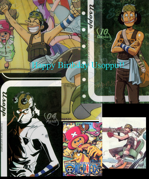 HAPPY BIRTHDAY USOPPU!!! Man, you are the greatest! You are definatly getting the award for kind hearted person! You're so kind to everyone! You're so unappriciated! You make me so happy! TT^TT But the recent chapters don't make me too happy. It really makes me depressed. After all you've done too! NNNNnnNnNOOOOOooOooOo!!! I'm going to cry now. But yay! Happy birthday and April Fool's day! This is your day!!! Yaaayy!!!