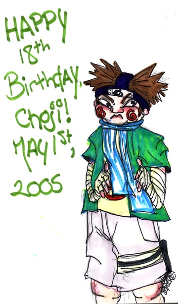 Happy birthday to Choji! Who I have horribly, horribly mangled. As I was drawing this, somebody informed me that Choji gets skinny somewhere in the series. I haven't seen that part yet (hurry up DVDs. . .). =) But! For me, I think Choji will always be the fat kid. 'cause, yanno, even fat people can be cool.